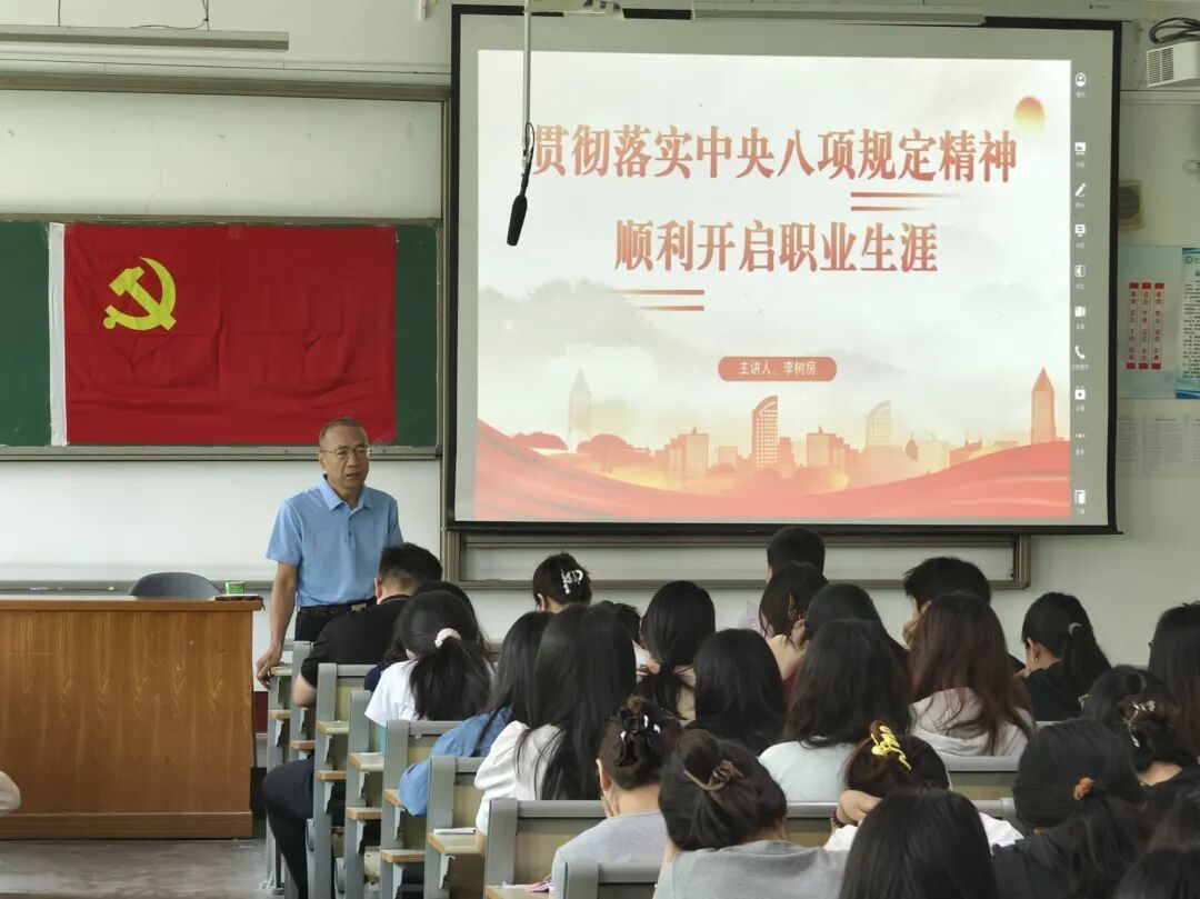 6月15日,3044am永利集团官网(质量学院)党委副书记、副院长李树房为学院2025届毕业生党员作了题为《贯彻落实中央八项规定精神 顺利开启职业生涯》的学习教育专题党课。