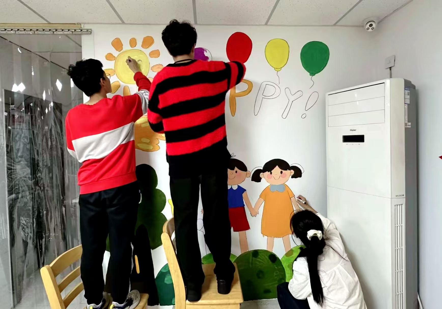 为使孩子们感受到愉悦与温馨,成员们精心构思,坚持从儿童视角出发,筹划设计了参天大树、缤纷气球、身姿优雅的长颈鹿、灿烂的太阳、纯真的小孩等符合儿童审美的图画元素。在绘画过程中,成员们分工负责起稿、勾线、配色、调色,用流畅的线条和鲜亮的调色将各类图画元素融洽地组织到一起,并齐心协力完成了工作量巨大的涂色环节,在大家高效努力的合作下,幅绚丽多彩的墙绘作品完美呈现,一条条线条、一个个画面无不饱含着志愿者对少年儿童深深的关爱与期待,焕然一新的墙面也使得兴业社区服务中心的儿童活动区充满温馨活力、明媚欢畅。