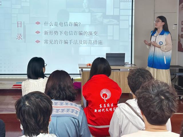 电信诈骗事件多发,个人财产保护成效直接关乎社区居民的切身利益。主讲人播放反诈骗宣传视频,志愿者们与社区居民进行交流和互动,初步了解社区居民对于诈骗的了解及重视程度。随后,主讲人宣讲反诈骗PPT,从“电信诈骗的本质”、“电信诈骗新演变”、“常见诈骗手法及防范措施”三个方面展开讲述,宣传反诈知识,并结合真实的诈骗案例,深入浅出地讲解了电信诈骗的特征、防范措施等,扎实做好防诈骗宣传工作。志愿者们提醒社区居民不要轻信任何中奖的短信和链接,更不要随意参与刷单返利、网络贷款等活动,如若遇到可疑情况要及时求助。社区居民认真倾听并积极学习相关反诈知识,主动发言提出疑问,与志愿者们积极进行互动交流,进一步加深了对新型诈骗方式及防范措施的了解,增强了自身的财产保护意识。
