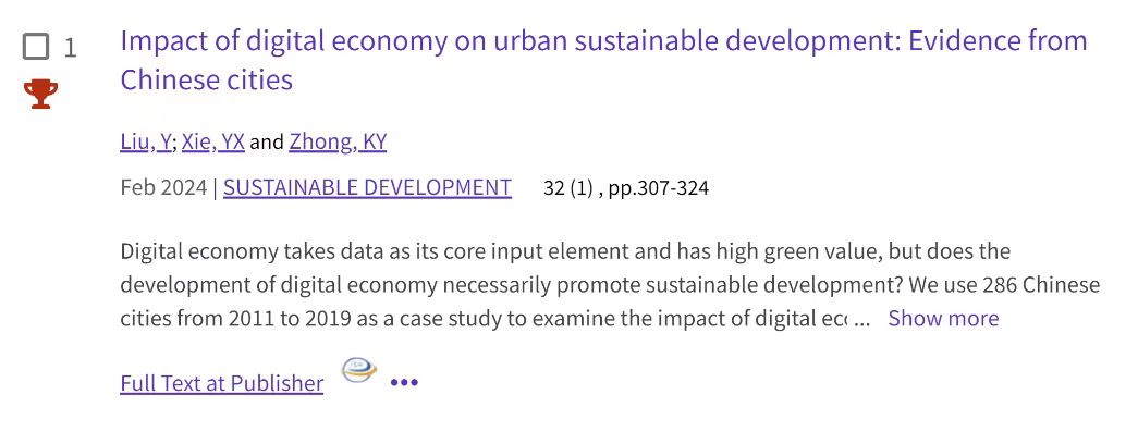 根据ESI最新公布的数据显示,永利官网经济系教师刘洋以第一作者在《Sustainable Development》发表的题为“Impact of digital economy on urban sustainable development: Evidence from Chinese cities”的SSCI期刊论文,入选ESI高被引论文,进入全球前1%论文之列。