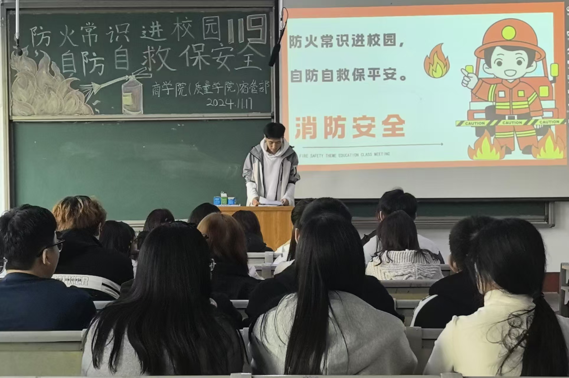 为深入推进校园消防安全宣传工作,进一步提升学生消防安全保护意识,11月17日,3044am永利集团官网于东校区1#301开展“防火安全进校园,自防自救保安全”消防知识主题讲座,学院宿管部学生代表仇洲烁及60位同学参加本次活动。