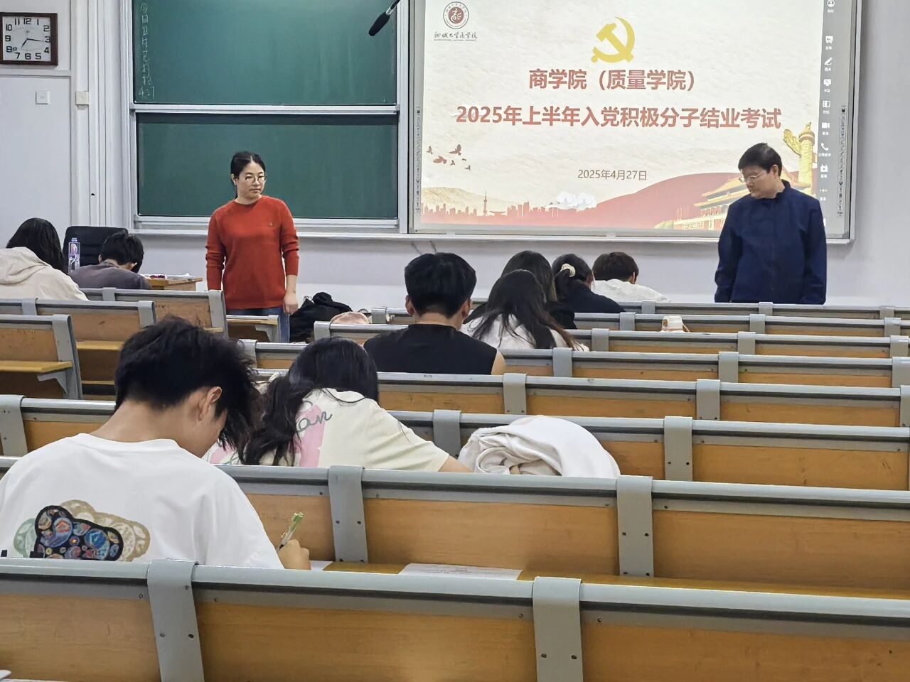 4月27日,学院举行入党积极分子结业考试,2025年上半年入党积极分子参加。考试内容涵盖党的基础理论与知识,重点考察习近平新时代中国特色社会主义思想、《中国共产党章程》以及党史等方面内容,通过闭卷形式检验学习成效。考试期间,学院党委书记公维才、组织员由玲对本次考试进行全程监督指导,确保考试过程公平、公正、公开。入党积极分子们精神饱满、态度严谨,严格遵守考场纪律,认真思考每一道题目,专注作答,考场秩序井然。他们用实际行动展现了对党的忠诚和向往,以及积极向党组织靠拢的决心。